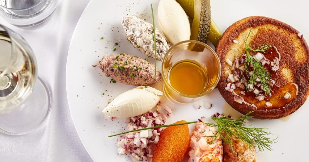 Meripaviljongin blinit saavat valintasi mukaisen kruunun erilaisista mätivaihtoehdoista, lohitartarista, skagenista tai sienisalaatista.